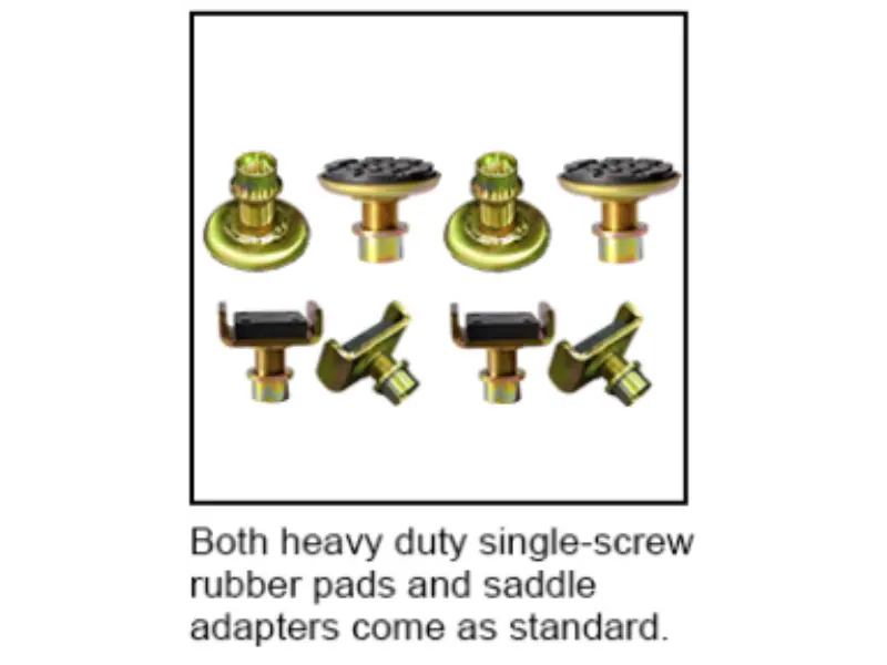 Included Accessories – Standard rubber pads, saddle adapters, toe guards, and extension adapters for enhanced flexibility.