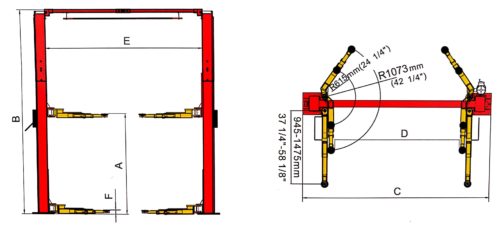 The AMGO OH-9 2-post clear floor car hoist features super asymmetric lift arms and adjustable height two piece columns. Can be installed in 12′ ceiling shops. Freight and local warehouse availability is shown after you add to your cart and provide your address.