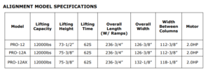 The PRO-12A can lift vehicles up to 12,000 lbs., making it suitable for cars, SUVs, and light-duty trucks commonly serviced in alignment and repair shops.