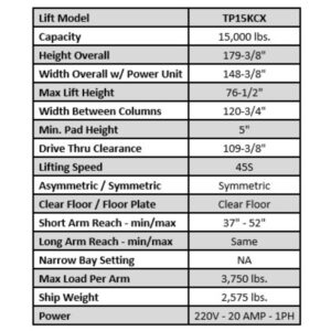 Its symmetric arm design, spin-up lift pads, and included stackable adapters make it a versatile option for various vehicles and applications. Backed by a robust chain drive system and dual-point lock release, this lift ensures smooth operation and secure lifting, even under heavy loads. Whether you’re a professional technician or a dedicated hobbyist, the TP15KCX delivers exceptional performance.