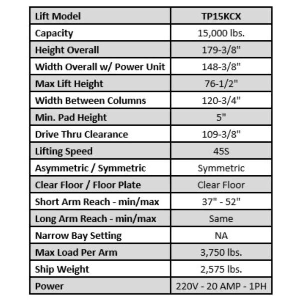 Its symmetric arm design, spin-up lift pads, and included stackable adapters make it a versatile option for various vehicles and applications. Backed by a robust chain drive system and dual-point lock release, this lift ensures smooth operation and secure lifting, even under heavy loads. Whether you’re a professional technician or a dedicated hobbyist, the TP15KCX delivers exceptional performance.
