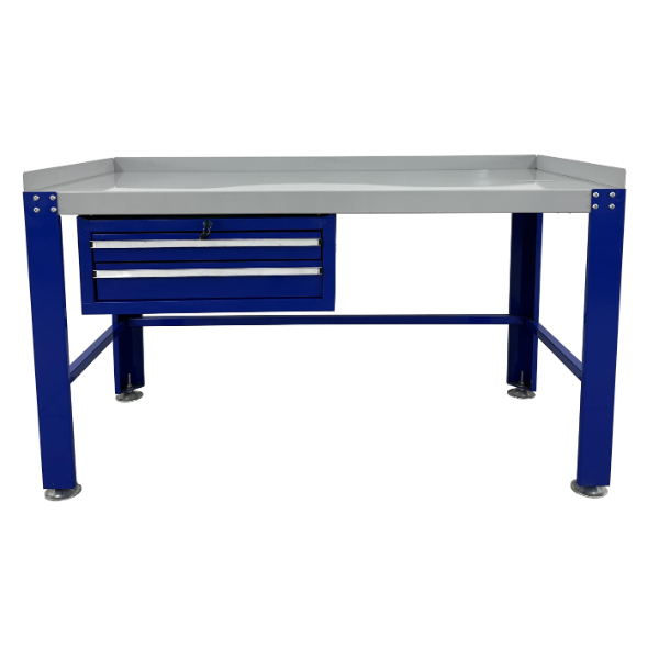 The heavy duty design has solid legs and a blue powder coated finish. This table is the perfect size and build for any home garage, bike shop, or industrial work space.