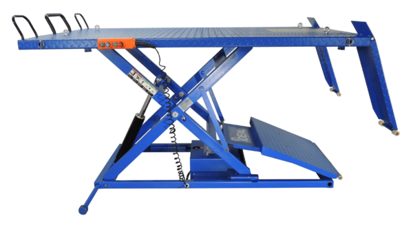 The hand held remote pendant is easy to use and has a magnetic base to keep it secure to the table for storage. The retractable center ramp and drop-down side extension ramps, ensures that you can walk around and access the back-side of vehicles on the lift. One piece side extensions ensure a sturdy and solid platform that extend the width to 65″.