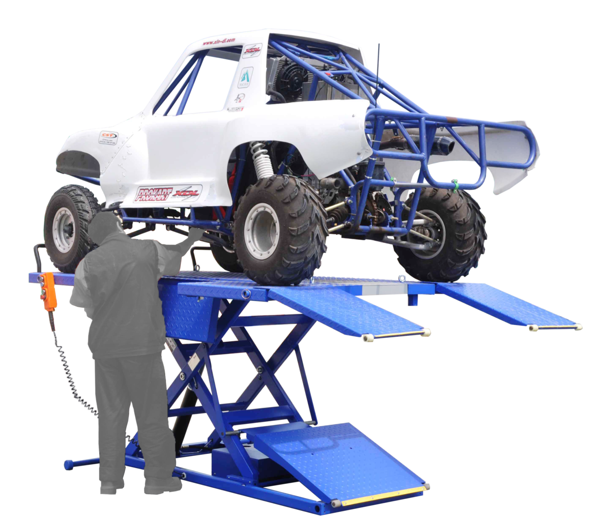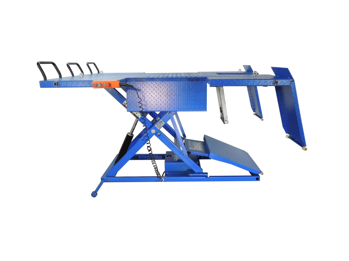 The hand held remote pendant is easy to use and has a magnetic base to keep it secure to the table for storage. The retractable center ramp and drop-down side extension ramps, ensures that you can walk around and access the back-side of vehicles on the lift. One piece side extensions ensure a sturdy and solid platform that extend the width to 65″.
