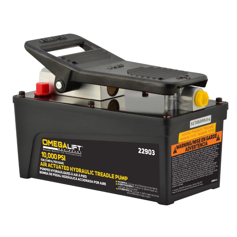 Omega Lift Logo SquareThe Omega 22903 is a 10,000 psi hydraulic foot pedal treadle pump.  Using 110 – 175 psi of shop supply air, hydraulic fluid is pumped from the reservoir to your single acting ram.  Includes the patented built in pressure by pass system to protect the pump from overload.
