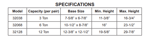 Designed to be used in pairs, the Omega 32038 are rated for 3 Tons. For heavier loads consider the Omega 32128 Jack Stands or Omega 32068 Jack Stands.