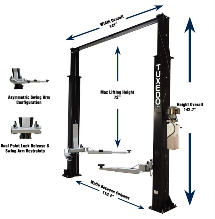 Tuxedo TP9KAC-TUX Two-Post Car Lift: Clear Floor Design and 9,000 lbs Capacity