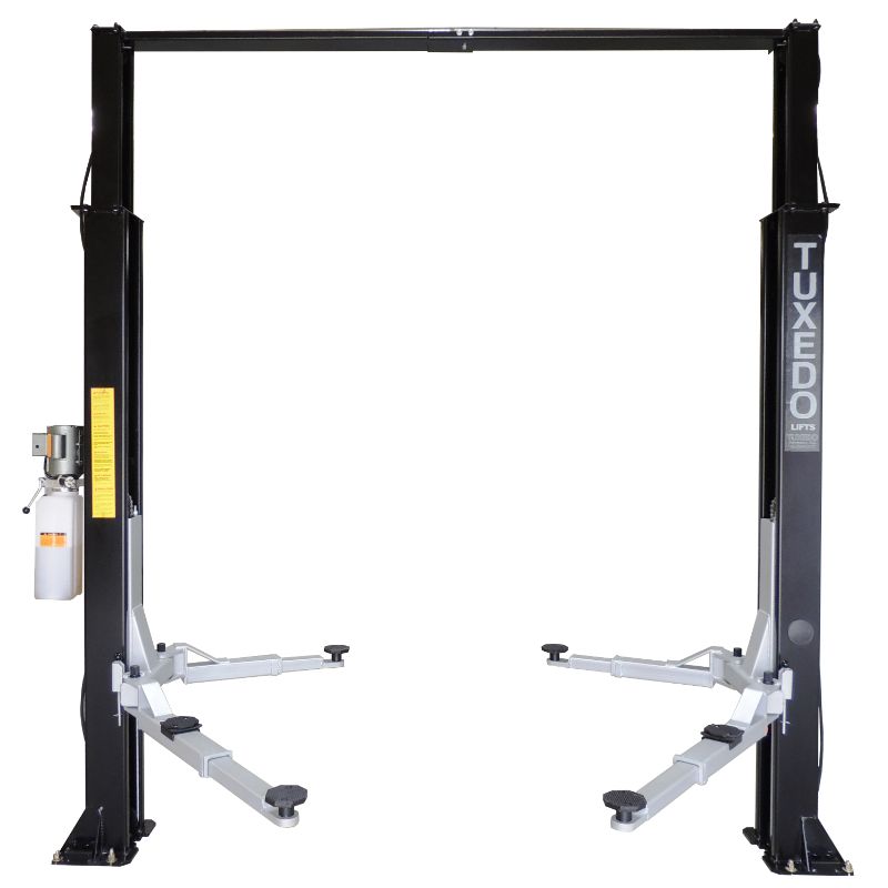 Tuxedo TP9KAC-Tux Two Post Lift rated at 9,000 lbs., economically priced for unmatched value. Asymmetric design includes height adapters.