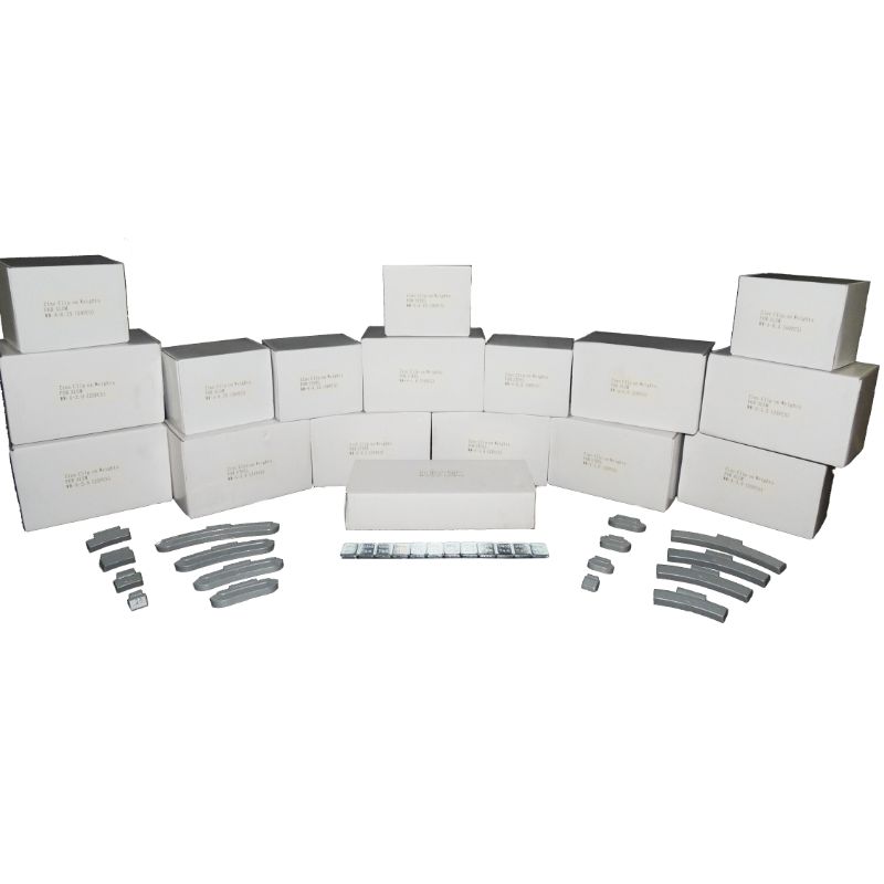 Wheel Weights-Deluxe includes a variety of steel and aluminum clip on wheel weights plus 50 strips of 12 squares of 25 oz adhesive weights.